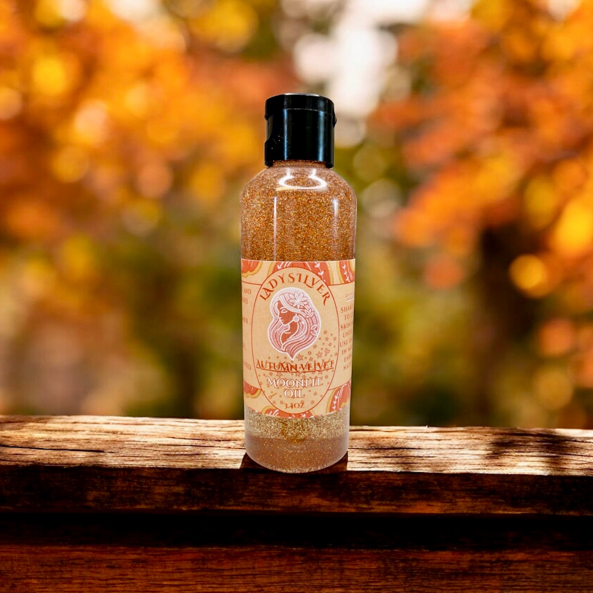 Wrap your skin in a radiant autumn glow with Autumn Velvet Moonlit Oil. This luxurious, lightweight shimmer oil blends nourishing botanical oils with a cozy fall scent of cinnamon, pumpkin spice, and warm sugar cookie.